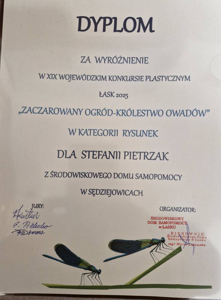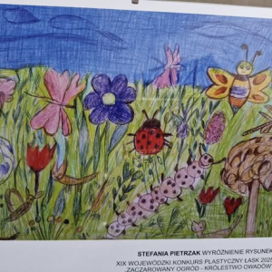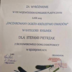 Komisja konkursowa XIX Wojewódzkiego Konkursu Plastycznego "Zaczarowany ogród – Królestwo owadów" organizowanego przez Śds Łask pod honorowym patronatem Burmistrzyni Łasku Pani Moniki Mrowińskiej, wyróżniła prace wykonaną w naszej pracowni plastycznej.
