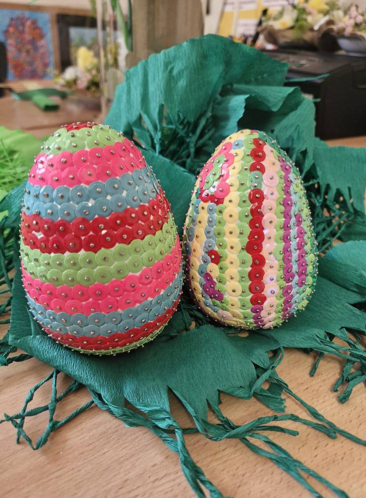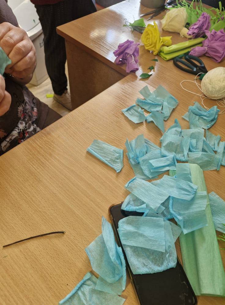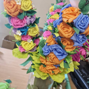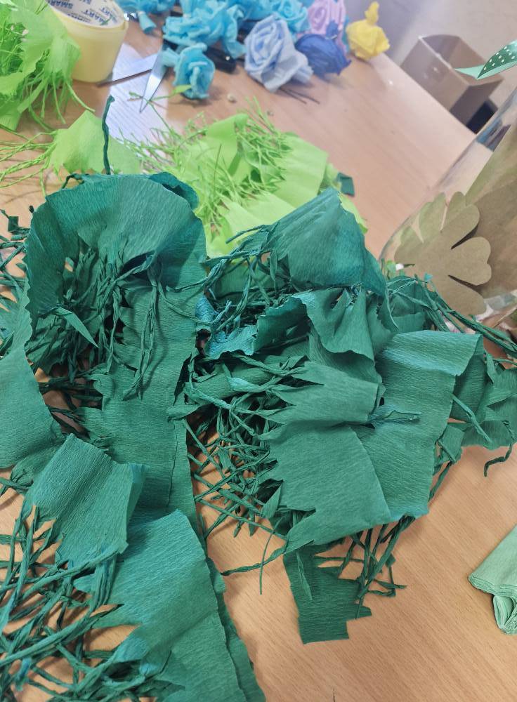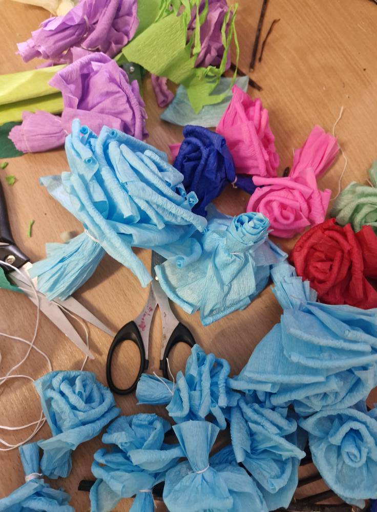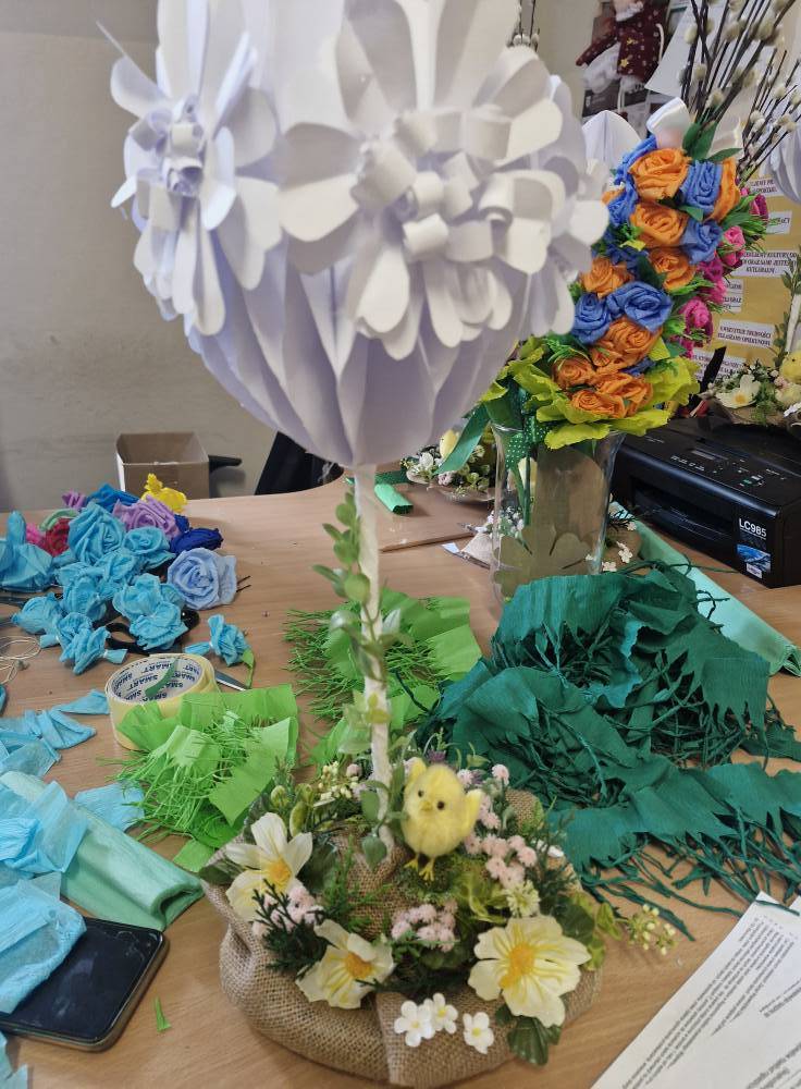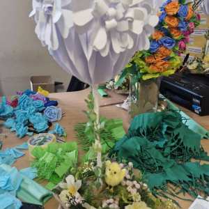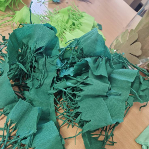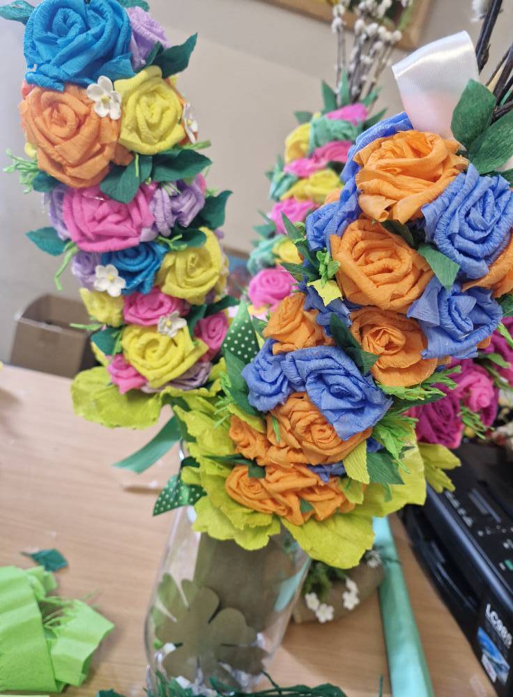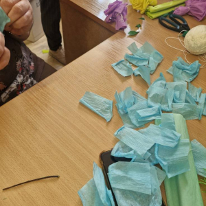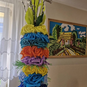 Uczestnicy z zaangażowaniem tworzą piękne, kolorowe palmy, które będą wspaniałą ozdobą tej wyjątkowej niedzieli.